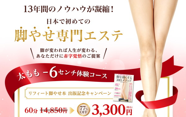 足やせを専門にしているエステがあるのですがご存知でしょうか?リフィートと呼ばれるエステなのですが、ダイエットのための足やせコースなど様々な足やせのためのコースが用意されている専門のエステです。